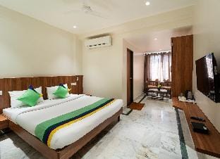 Spacious deluxe room with a comfortable double bed, clean marble flooring, AC, TV, and a cozy seating area for a relaxing stay.